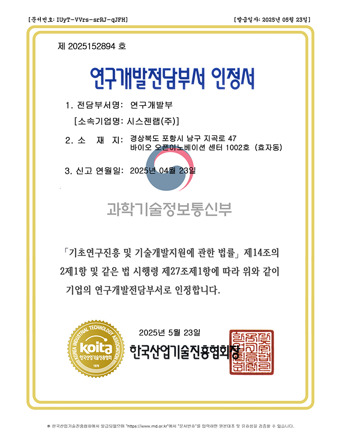 - 제 10-2216943 호 (2021년) 간암 진단을 위한 바이오마커 조성물